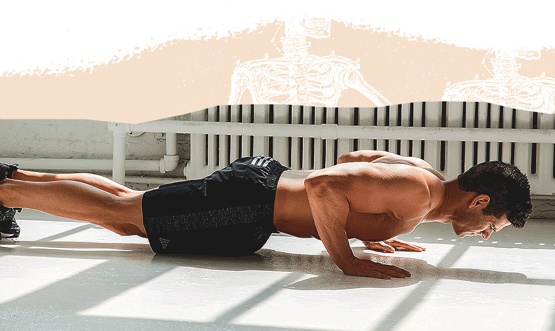 Когда ты находишься в исходной позиции, твое тело ровное, как струна. Это касается и спины, и ног, и плеч. Нередко у малотренированных людей наблюдается выгибание или сгибание плеч, что является результатом слабых мышц плечевого сустава, таких как нижняя часть трапециевидной мышцы. Это не позволяет твоим лопаткам наклониться так, как это необходимо для отжиманий. Кроме того, на неустойчивость плеч влияют слабые передние зубчатые мышцы, расположенные на туловище под грудью.
