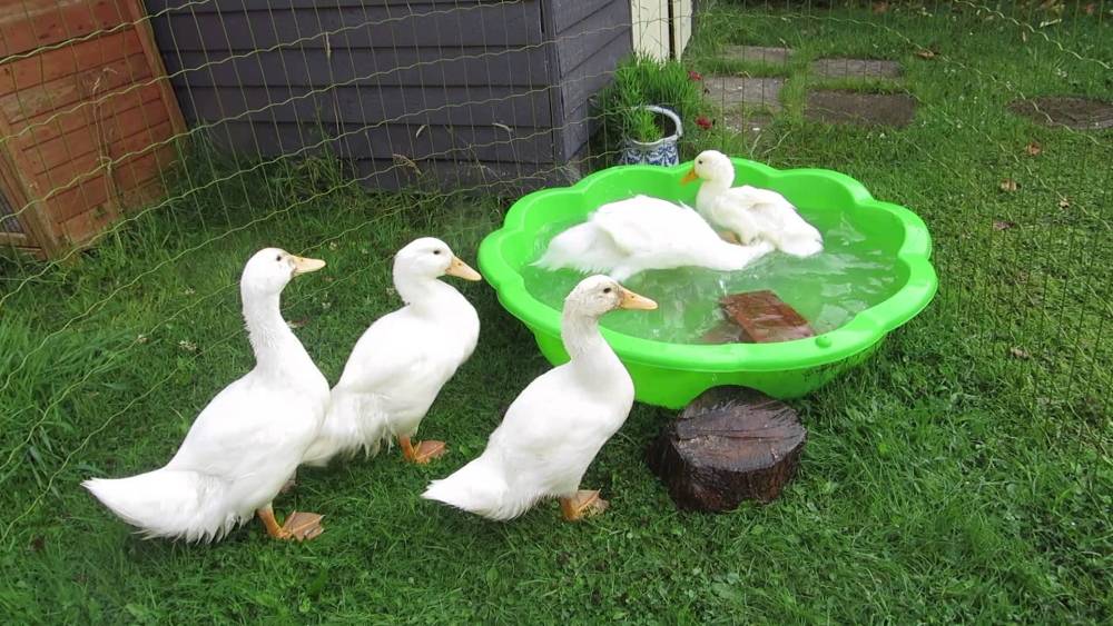 Для вольного летнего содержания кроме сарая желательно организовать вольер выгула с соломенными подстилками. Весной и летом около помещения обязательно должен быть бассейн или водоем с глубиной, достаточной для плавания. Зимой и осенью водные процедуры исключаются, чтобы уберечь стаю от заболеваний и вымирания.