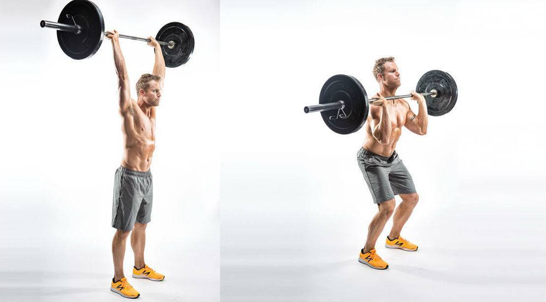 - На вдохе медленно опустите штангу вниз на ваши ключицы, немного согнув колени для амортизации в момент касания.