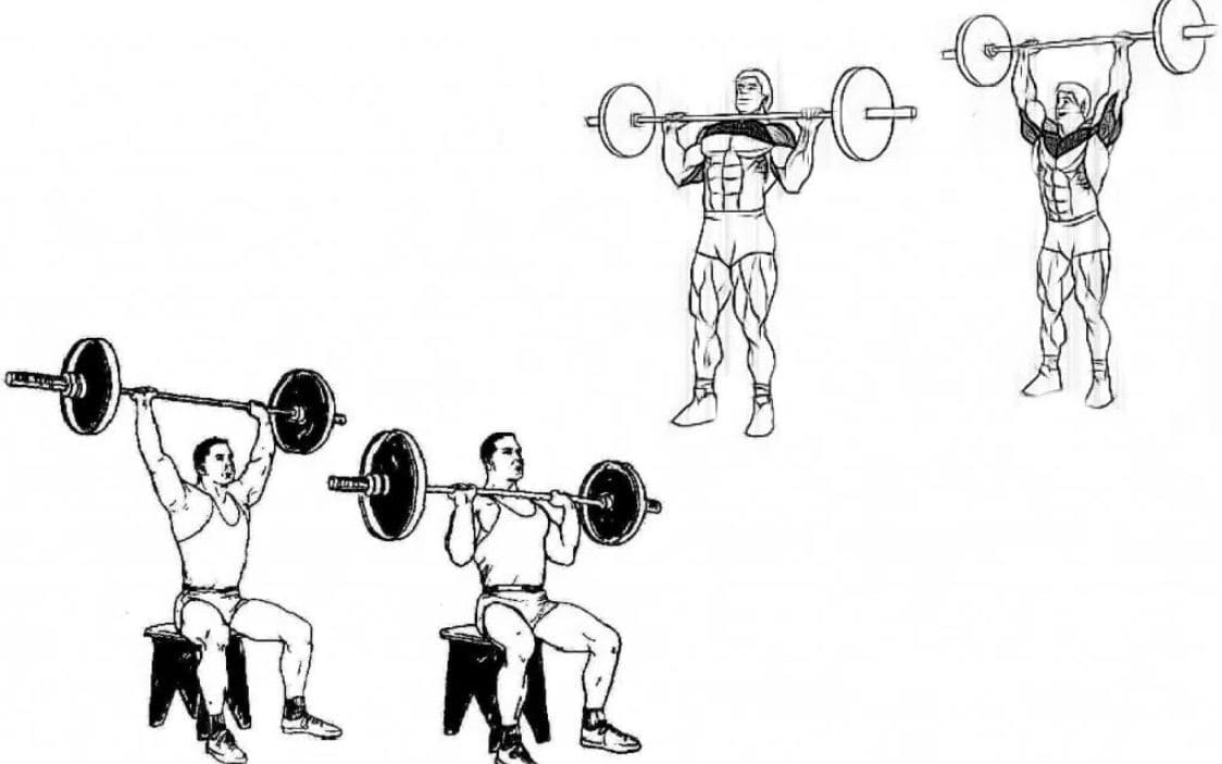 Во время упражнения стоя идет сильная нагрузка на поясницу. Если при этом выполнять его неправильно, в нижней части спины могут возникнуть боли и даже травмы. Если поясница слабая, лучше выполнять армейский жим сидя. В этом случае порядок действий будет немного другой.