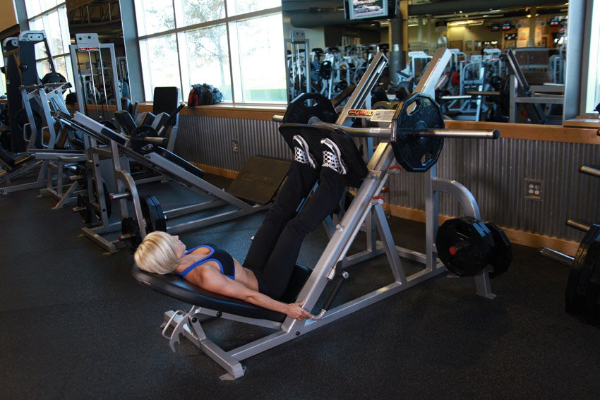 Упражнение имитирует работу мышц ног во время приседаний, но при этом предохраняет позвоночник от компрессионной нагрузки. Выполняется в специальном тренажере с движущейся под углом 45° кареткой. Техника: