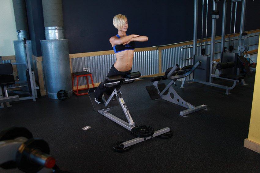 Займите необходимое положение на тренажере. Уприте икроножные мышцы в подушки тренажера, отведите руки за голову и скрестите их. Начинайте медленно опускать корпус к полу. В конечной точке вы достигнете угла в 90 градусов. После – поднимайте туловище в исходную позицию.