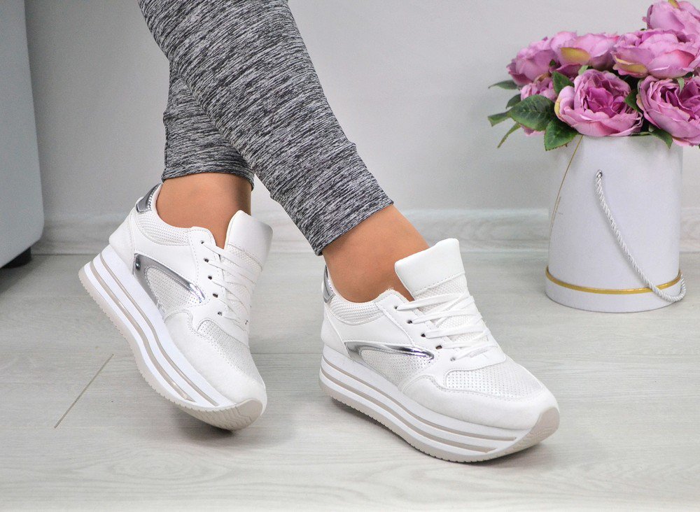 - Модные белые кроссовки на платформе не выходят из моды уже несколько сезонов. Они выглядят ярко и нарядно, дарят обладателю удобство, уверенность в себе. Подходят для создания романтического образа, сочетаются с платьями стилей кэжуал, спорт-шик.