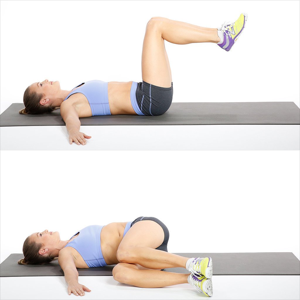 - Сделайте 20–30 повторов. Для повышения сложности ноги можно выпрямить и приподнять над полом.