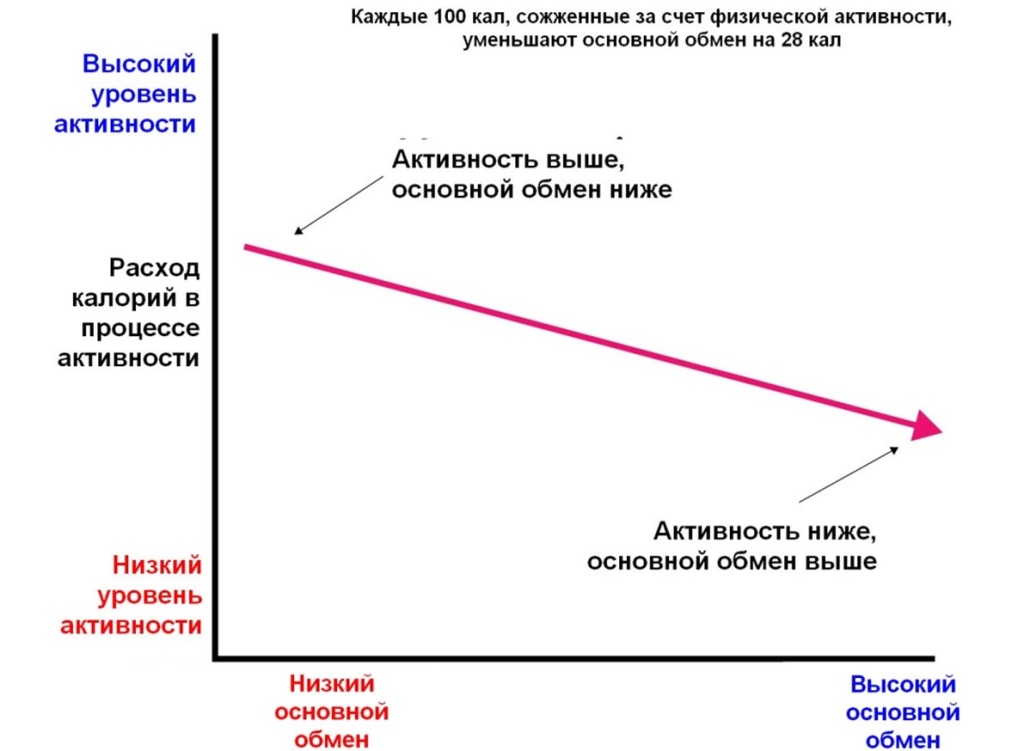 Как и ожидалось, между BMR и TDEE обнаружилась четкая положительная корреляция: по мере увеличения BMR увеличивался и TDEE. Однако между AEE и BMR корреляция была отрицательной: по мере того, как AEE увеличивался, BMR снижался. В частности, на каждые стокалорий, сожженных за счет AEE, уменьшение BMR составило 28 калорий (см. рисунок).