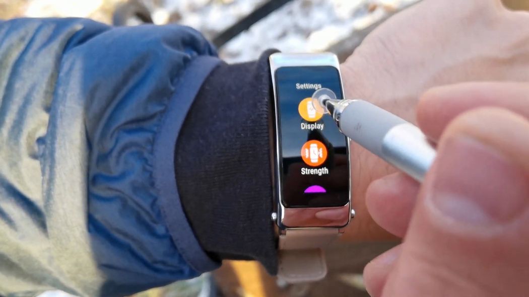Корпус устройства состоит из двух частей – продолговатой крупной капсулы с объемным прямоугольным AMOLED экраном диагональю в 0,95 дюйма и высокопрочного стекла. Закаленное стекло имеет выпуклую форму и дополнительную защиту из олеофобного покрытия. Здесь же находится крупная сенсорная кнопка.