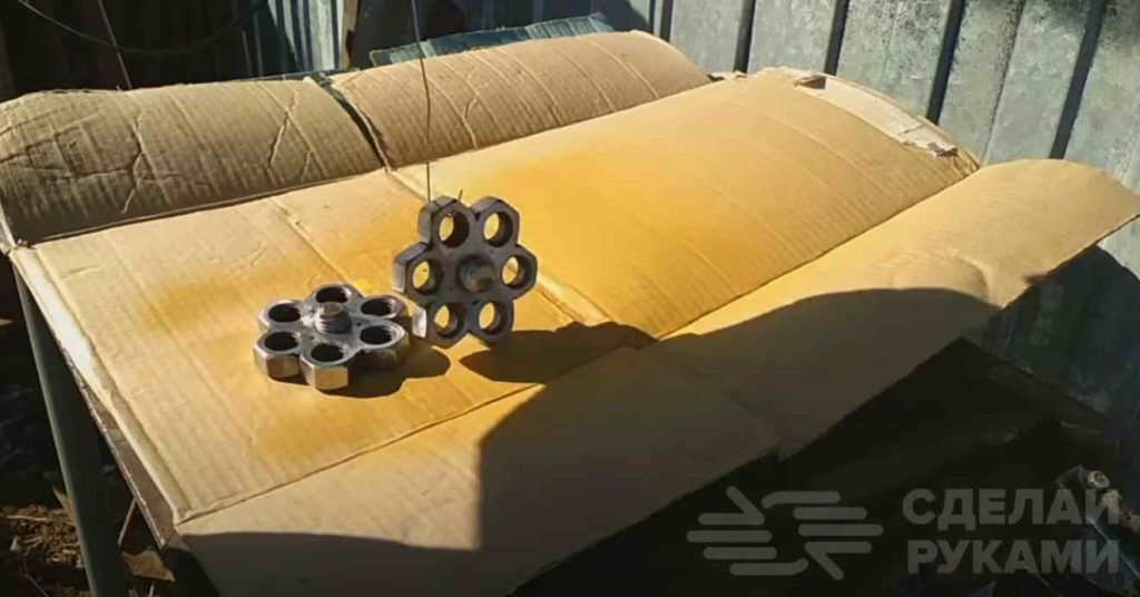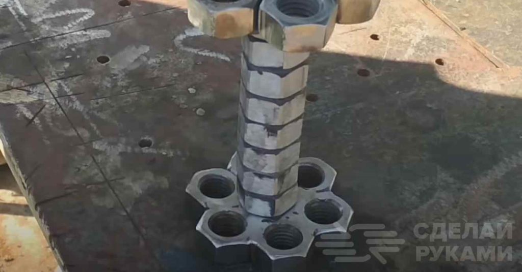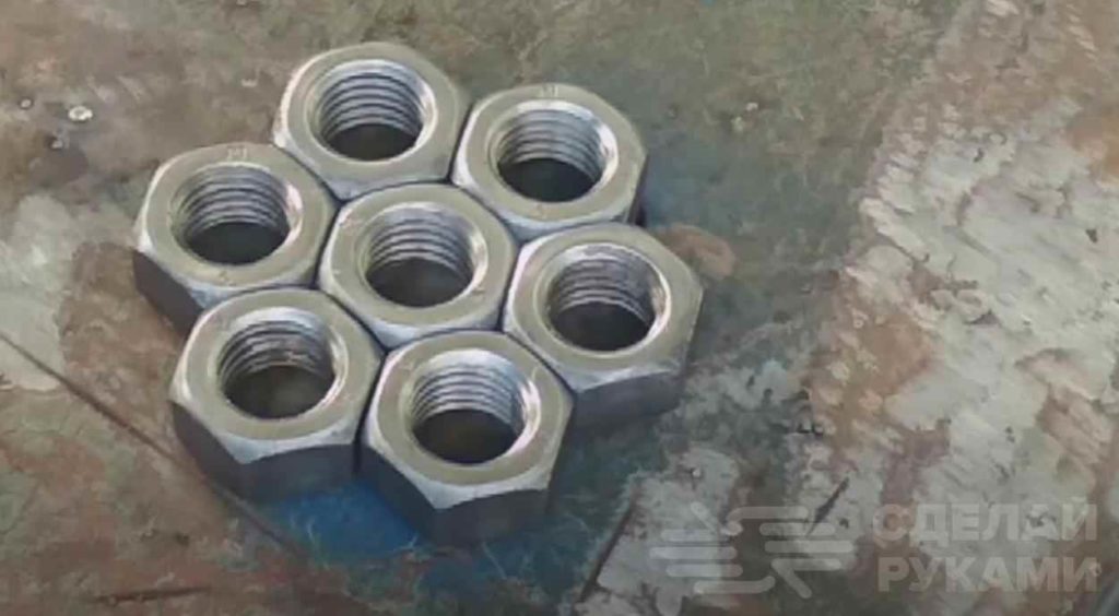 Сначала изготавливаем первый блин. Для этого совмещаем вместе 7 гаек, и обвариваем. Сварные швы зачищаем болгаркой. По такому же принципу необходимо сделать и второй блин.