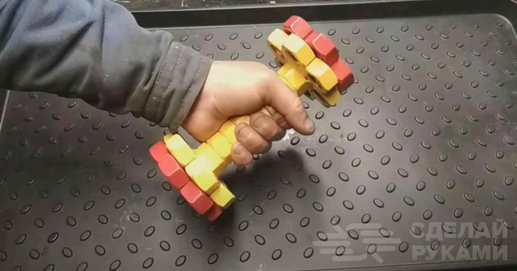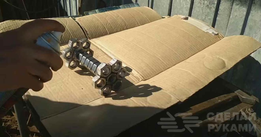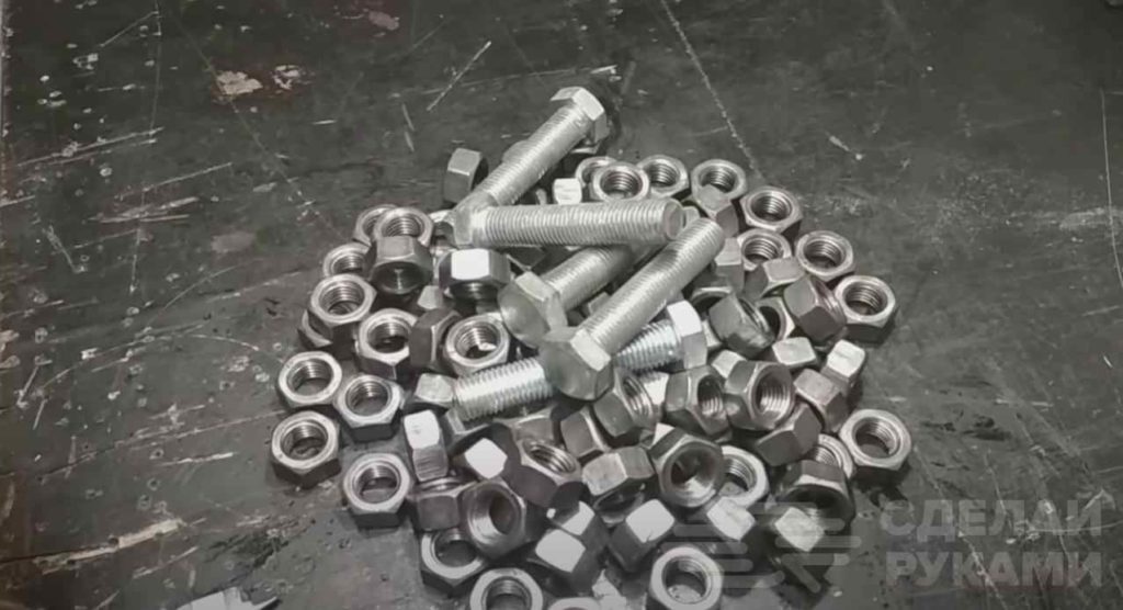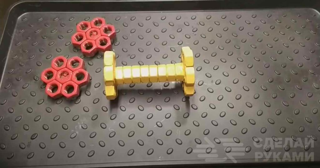 Такие спортивные снаряды можно сделать из металлических гаек и болтов. Идея самоделки принадлежит автору YouTube канала «Алексей Аюр». За основу используются болты и гайки М20.