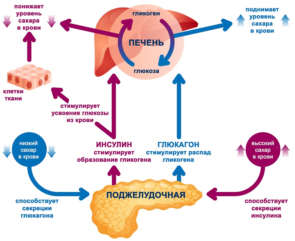 Инсулин – гормон, который, если говорить просто, продырявливает клетки, тем самым снижая уровень сахара в крови. В соответствии с энергетическим балансом в клетках организма прослеживается следующая зависимость. Если баланс положительный, то при выбросе инсулина клетки будут заправляться энергией, а если имеется дефицит калорийности, то инсулин будет опустошать клетки. Глюкагон же регулирует процесс превращения энергетического запаса в энергию. Иными словами, если имеется высокая гликемическая нагрузка, то этот процесс будет полностью остановлен, а это значит, что даже при отрицательном энергетическом балансе расщепление жирового депо или высвобождение дополнительной энергии будет невозможно.