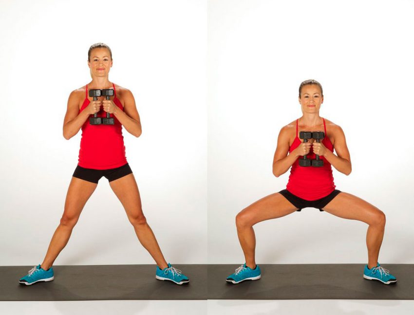 Во время подготовки к гоблет приседаниям делается один подход, потом ещё один: занятия без нагрузки, отжимания от пола, упражнение для пресса.
