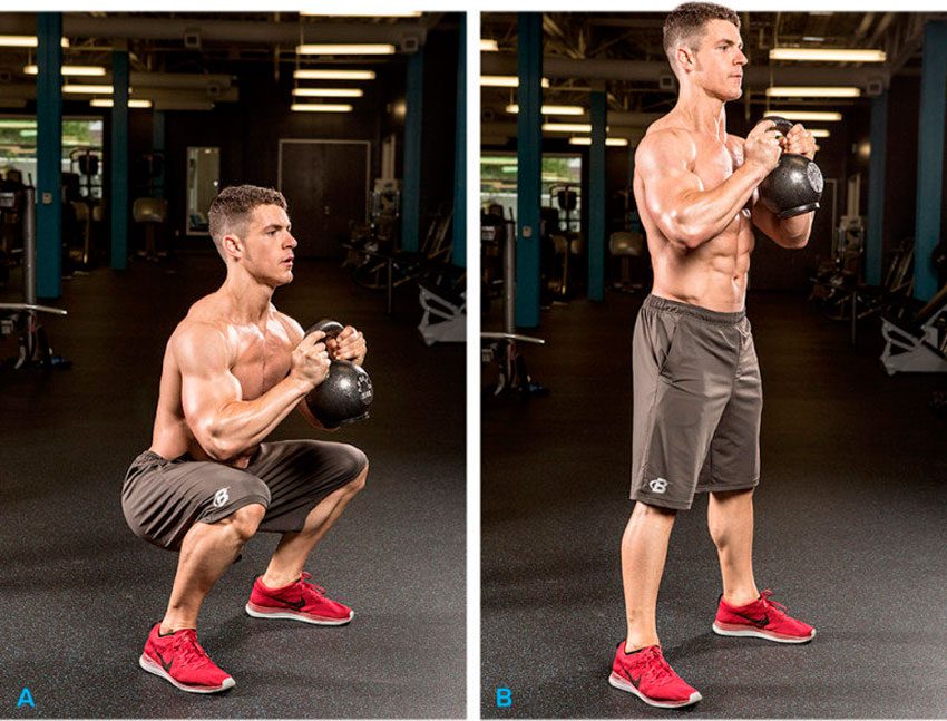 Снаряд в исходной позиции нужно держать двумя руками по бокам ручки на уровне груди. Ноги – на ширине плеч, носки чуть разведены в стороны. Затем происходит обычное при приседаниях сгибание ног до параллели бедер с полом (или чуть ниже) и дальнейший подъем, при этом одновременно распрямляются руки вместе с гирей. Не забывайте, что спину нужно держать ровной, не горбиться и не наклоняться.