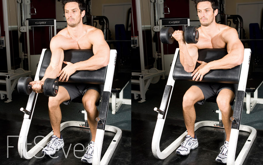 - Подъемы гантелей на бицепс на скамье Скотта.