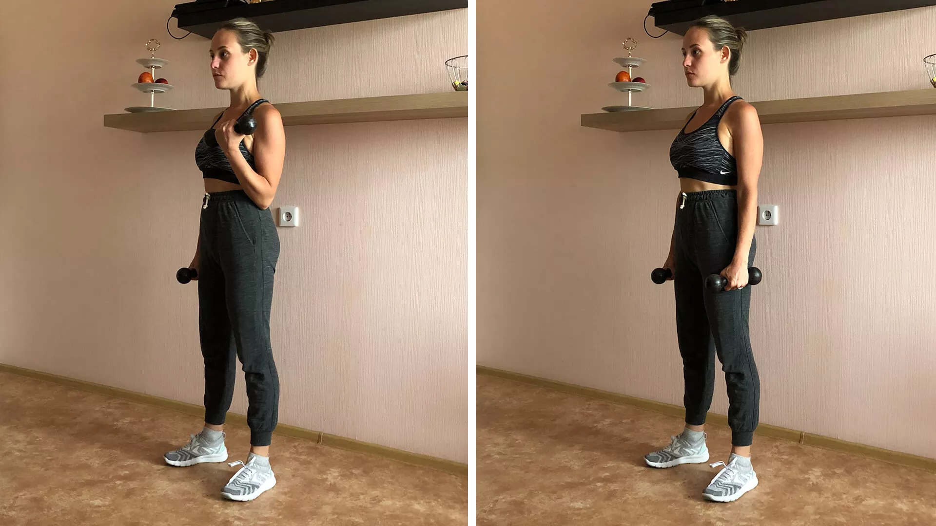 - В исходном положении ноги на ширине плеч, гантели в руках вдоль тела. Локти прижаты к бокам.