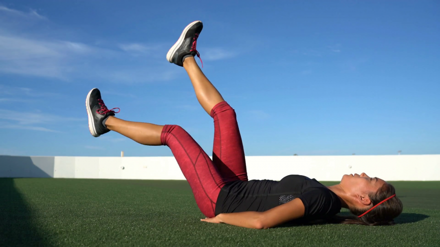 - Сомкните ноги вместе, а затем поднимите их максимально высоко. Для акцента на косых мышцах вы также можете приподнять корпус.