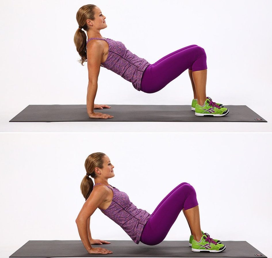 - Сесть, поставить руки, разведенные на ширину плеч, на край гимнастической скамейки, которая располагается за спиной.