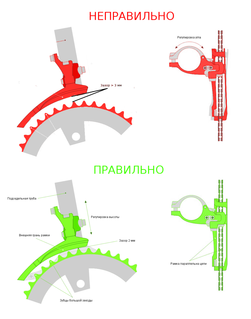 Продольная ось переднего переключателя направляющей рамки должна стоять параллельно к передним звёздочкам, а расстояние от низа наружной части до большой звёздочки, должно быть, не более 2 мм. Для правильной установки перекидки нужно снять цепь.