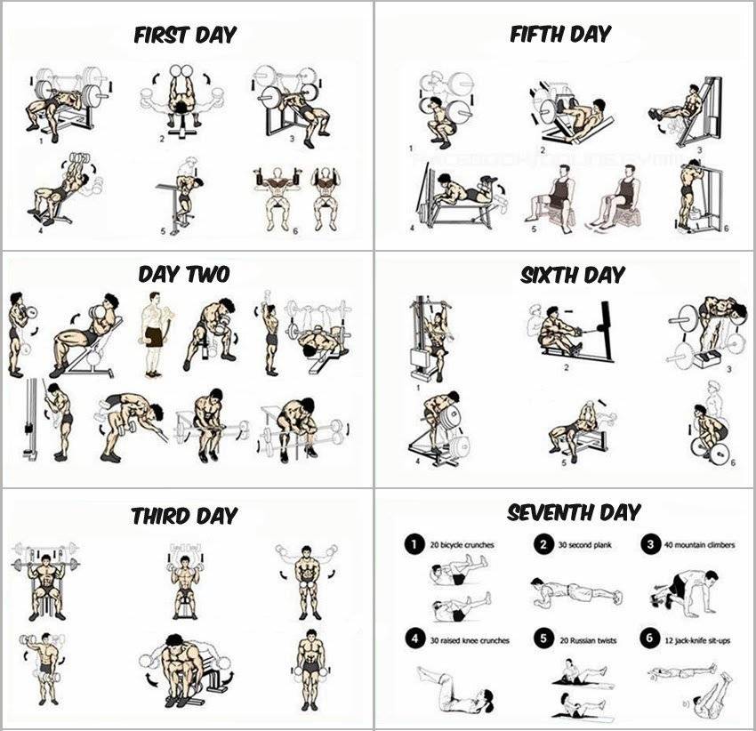 Тренировка должна состоять из шести упражнений. Каждая тренировка должна быть направлена на проработку одной или двух мышечных групп, например, первый день – грудные мышцы и трицепсы; второй день – мышцы спины и бицепсы; третий день – мышцы ног и дельтовидные