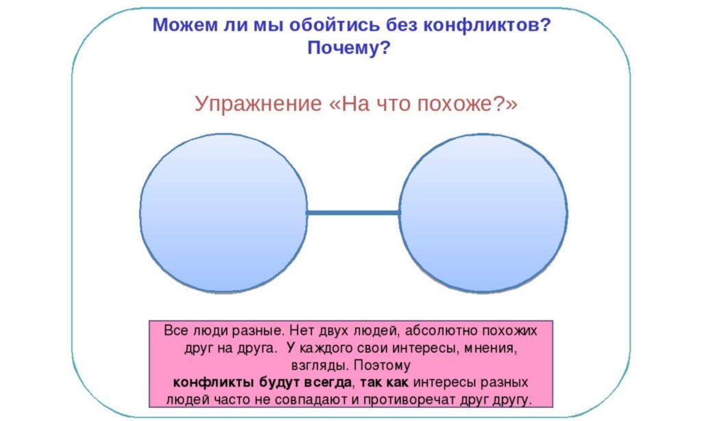 Конфликт — это всегда столкновение разных интересов, взглядов, мнений. Это неизбежное явление в общении между людьми. У каждого — своя правда. А истина, как всегда, где-то посередине. Не стоит рассматривать конфликт как зло. Нужно смотреть на него, как на возможность что-то прояснить в отношениях. Все зависит от того, с какой стороны посмотреть на конфликтную ситуацию.