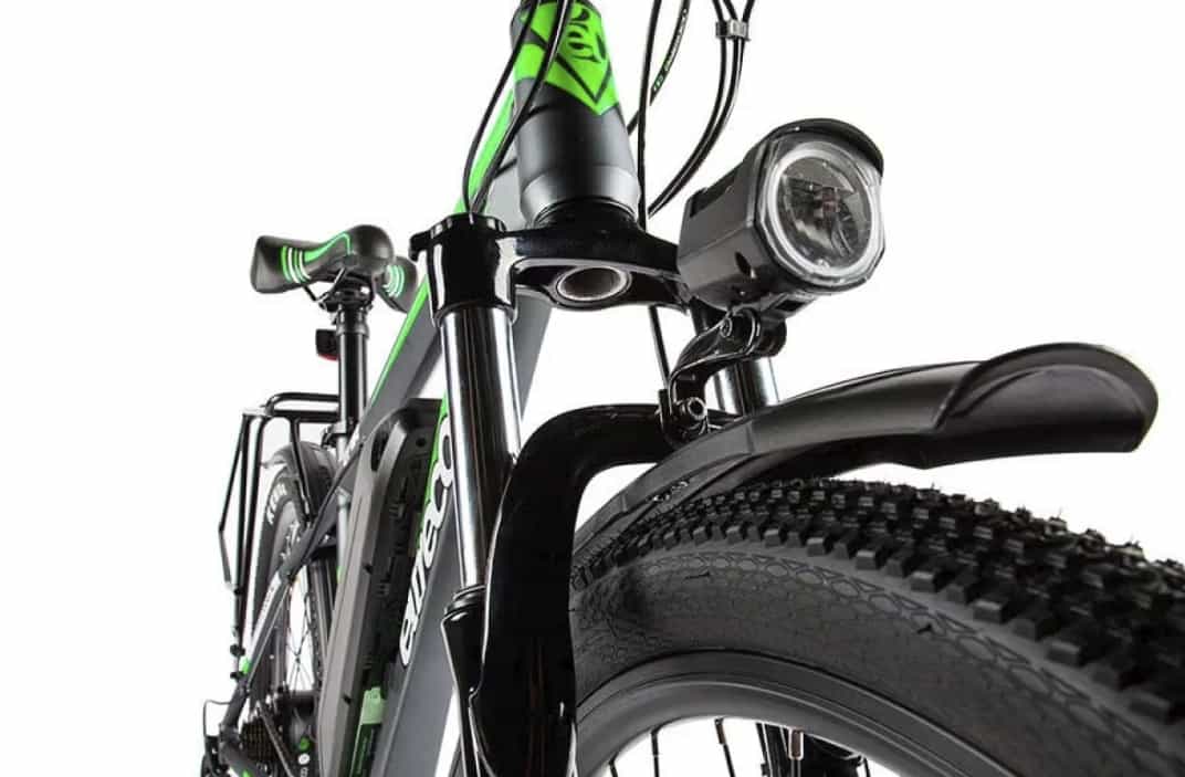 Eltreco XT750 — горный электровелосипед с дисковыми передними и задними тормозами, 7 скоростями, двигателем мощностью 350 Вт и аккумулятором емкостью 10,4 А-ч. В без подзарядки батареи хватит примерно на 50 км езды, а максимальная скорость, которую может развить этот байк, составляет 35 км/час.