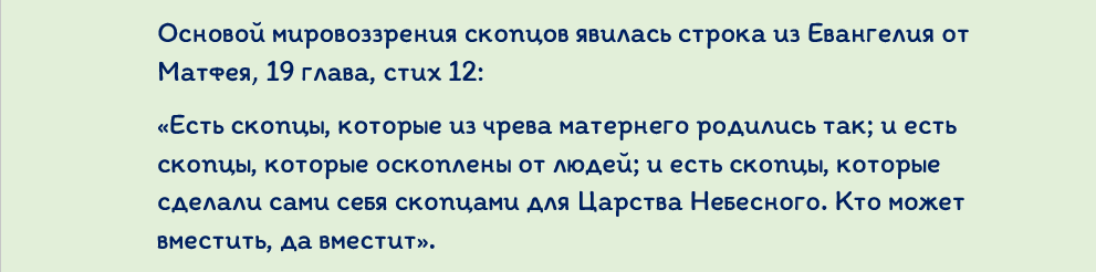 В XVIII веке появилась религиозная секта скопцов, приверженцы которой считали, что спасти свою душу можно только путем борьбы с плотью, а единственный путь к этому – оскопление, лишение «грешных» органов.