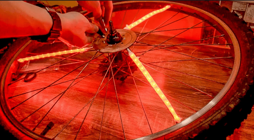 Чтобы отмерить, какая длина нужна – следует замерить на колесе или раме расстояние, которое планируется осветить. В случае с колесами не получиться прикрепить сплошную ленту по его диаметру, так как на нем есть спицы, именно в расстояние между ними и закрепляются отрезы ленты.