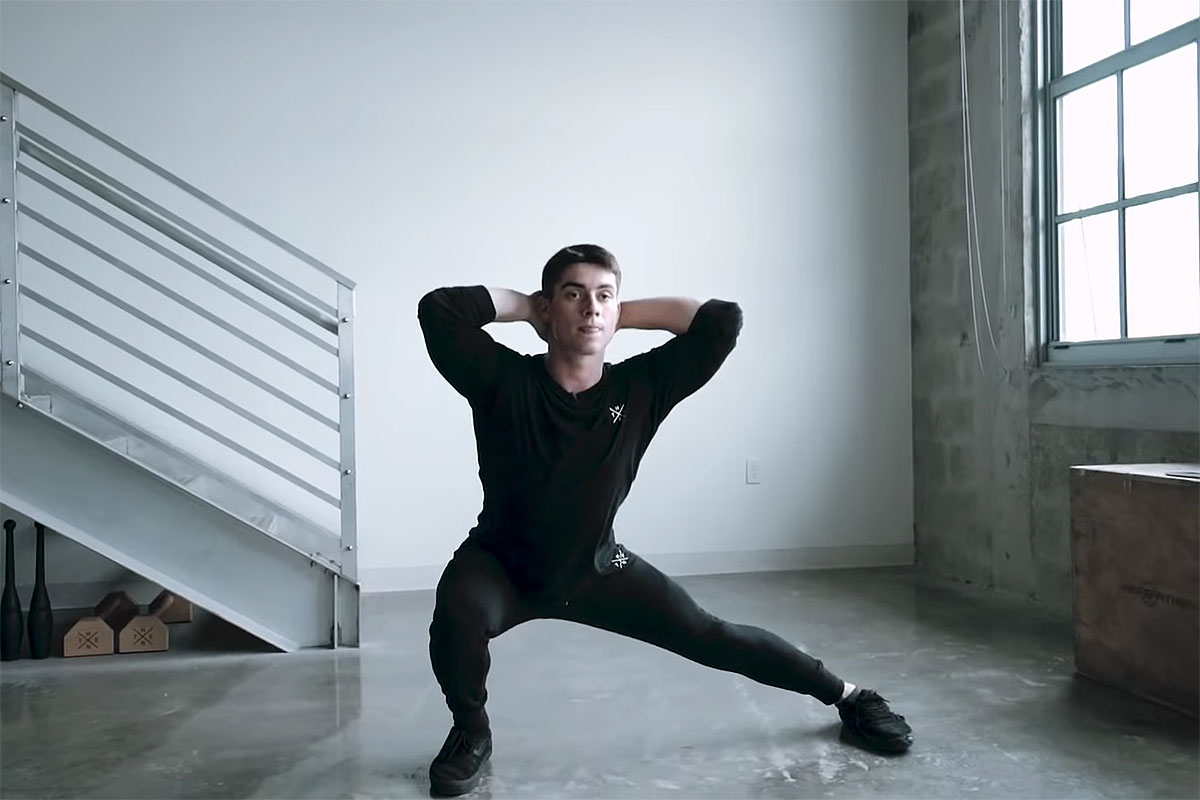 Для выполнения этого упражнения нужна хорошая растяжка задней поверхности бедра и ахилловых сухожилий. Правой ногой делайте выпады в сторону, а левую ногу держите прямой. Затем повторите аналогичные выпады другой ногой.
