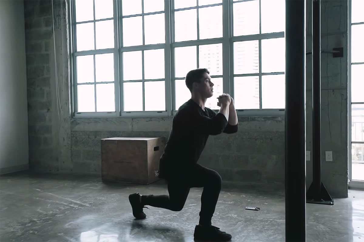 Когда делаете выпады, следите за тем, чтобы в нижней точке бедро передней ноги было параллельно полу, а колено не выступало за носок. Скрепленные в замок руки за головой усложнят выполнение упражнения, так как потребуют дополнительного внимания для поддержания равновесия.