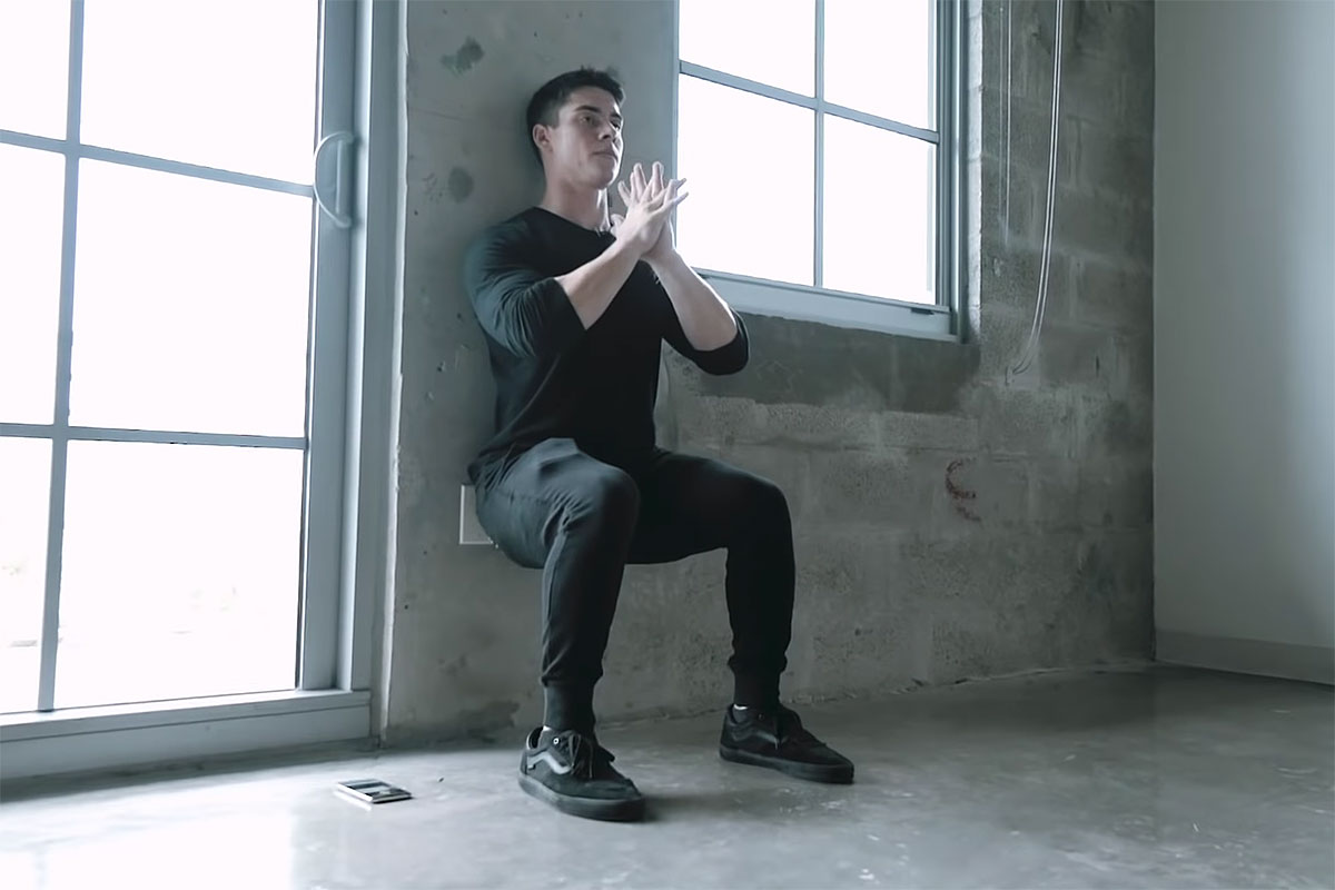Сделайте приседание у стены, как будто присаживаетесь на стул. Лопатки и поясница должны быть прижаты к стене, а руки держите перед собой. Сохраняйте статичное положение в течение 45 секунд. Если вам тяжело выдержать это время, то попробуйте облегченный вариант – упритесь руками в колени. Если вам наоборот легко делать это упражнение, то оторвите пятки от пола и держитесь только на носках.