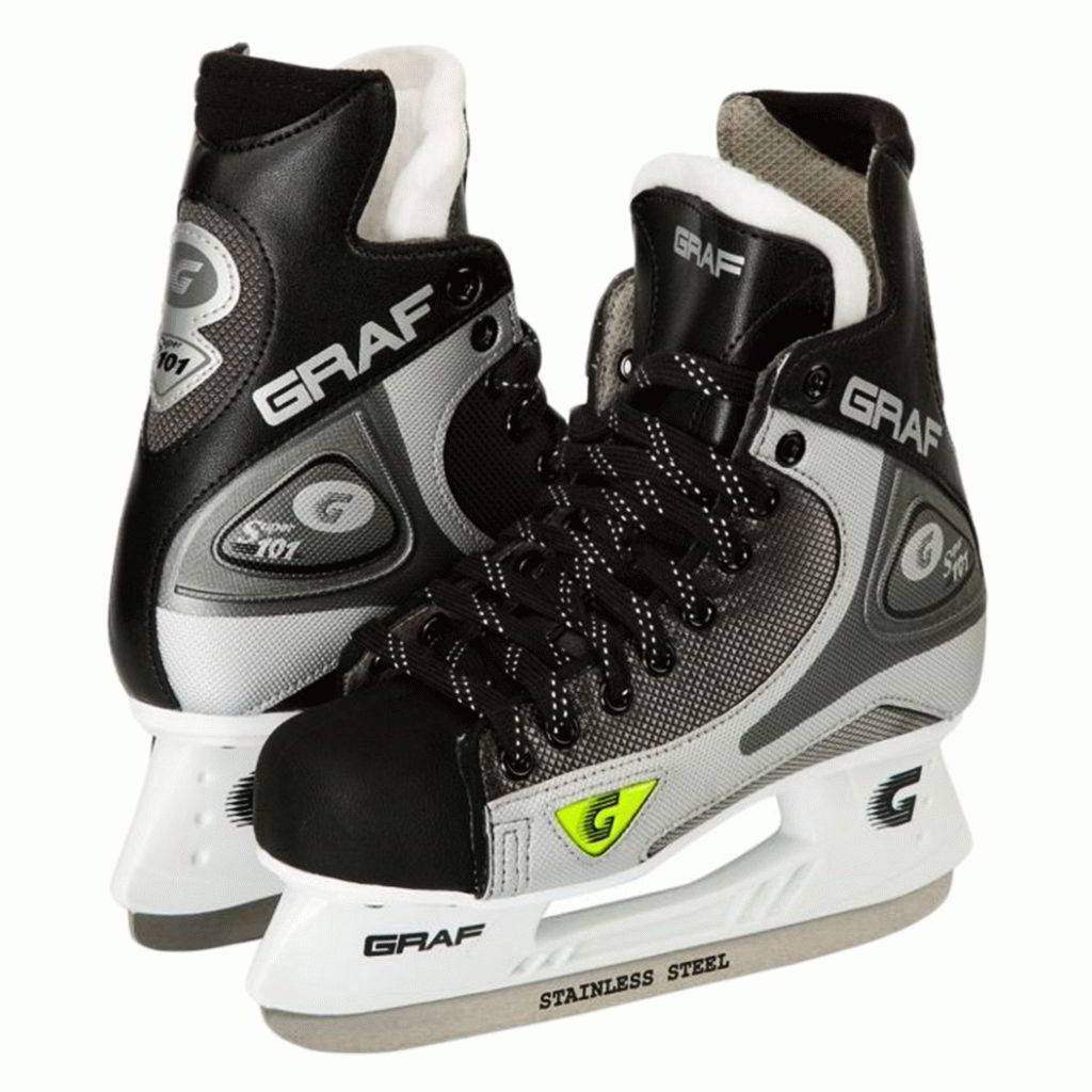 Graf (Швейцария). Этот бренд предлагает целую линейку коньков. Ботинки в них создаются из синтетического термоформуемого материала. Благодаря жесткому голенищу обеспечивается надежная фиксация голеностопа при тренировках и катании, поэтому риск получения травм сведен к минимуму. Подошва ботинок выполнена из облегченного пластика.