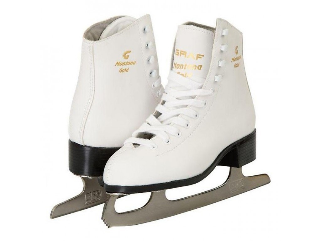 Фирма «GRAF» создала модель «Моntana gold» для начинающих фигуристок. Анатомический белый ботинок фиксируется на ноге при помощи шнуровки. Стальное лезвие покрыто защитным напылением.