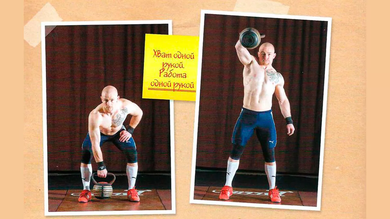 | Подъём гири с раскачиванием | Встать прямо, ноги шире плеч. В руках держать гирю, опустить её ниже за счёт небольшого приседания. Раскачивать гирю, поднимать её вверх на вытянутых руках. |
