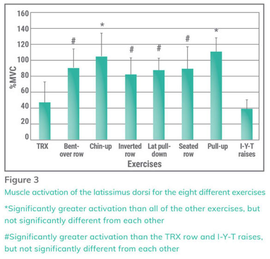3. Широчайшие: Больше всего активировали подтягивания прямым (pull-up) и обратным хватом (chip-up), также хорошие результаты у тяги в наклоне, подтягивания на низкой перекладине, тяги верхнего и нижнего блоков.