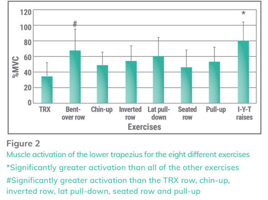 2. Низ трапеций: Максимально активировали IYT-подъемы, на втором месте тяга в наклоне, остальные 6 упражнений значительно отставали.
