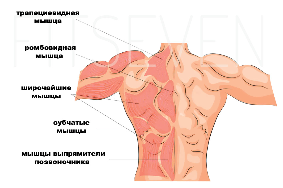 Мышцы спины делятся на три сегмента — трапециевидные (верх спины); широчайшие, ромбовидные и зубчатые (середина); а также выпрямители позвоночника (низ). Тренировка трапециевидных мышц придает спине массивность, широчайших — ширину, а развитие глубинных мышц выпрямителей укрепляет корпус и низ поясницы.