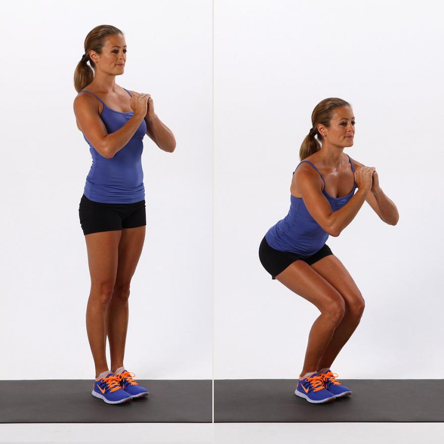 Для начала выполните серию приседаний. Это самые простые, но при этом крайне интенсивные движения. В особенности, если вы выполняете это упражнение, используя дополнительную нагрузку. Такая версия приседаний, при которой стопы стоят чуть шире плеч и носки развернуты в стороны на 45 градусов, прекрасно укрепляет ягодицы, стабилизаторы позвоночника, мышцы брюшного пресса и спины.