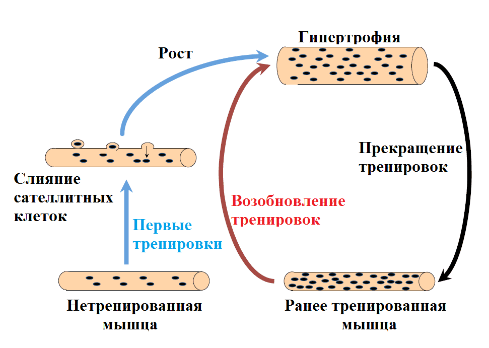 Но, самое главное, что новые, полученные в результате тренировок ядра никуда не исчезают! Когда вы снова хорошенько их нагрузите, они опять приступят к синтезу и вернут мышцам былую силу и объем.