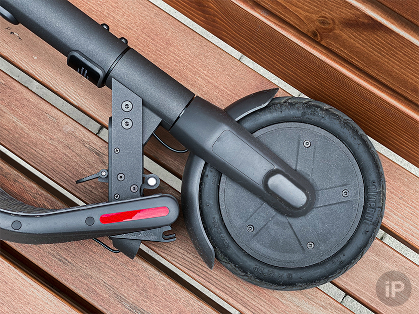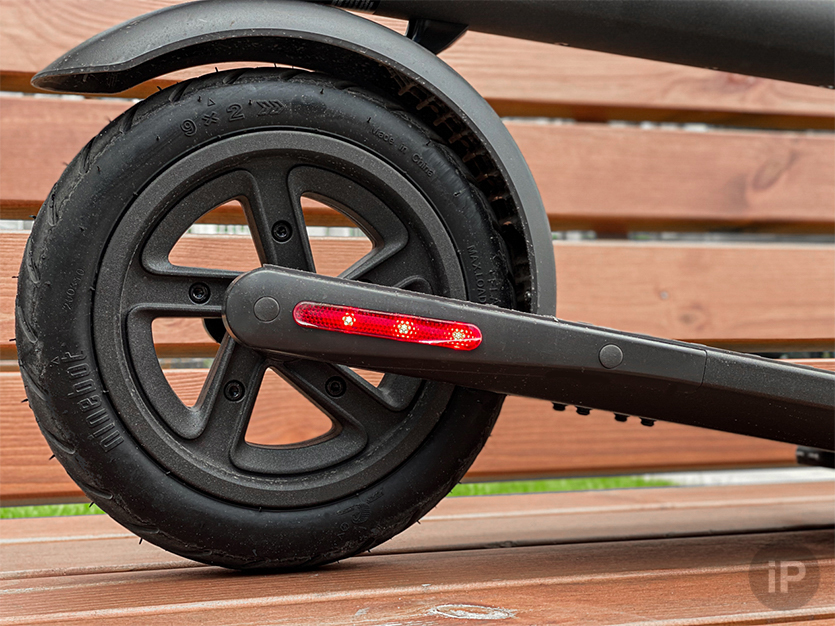 Диаметр колёс самоката — 8 дюймов. Это типичный городской вариант для ровных дорог, без особенных препятствий. Колёса выполнены достаточно стильно, особенно это касается заднего. Протектор на резине — асфальтовый, с неглубоким рисунком, что вполне подходит для городского режима. По бокам самоката расположены светоотражающие элементы, а сзади — полноценный стоп-сигнал, работающий при торможении. В обычном положении сзади горят габаритные огни.