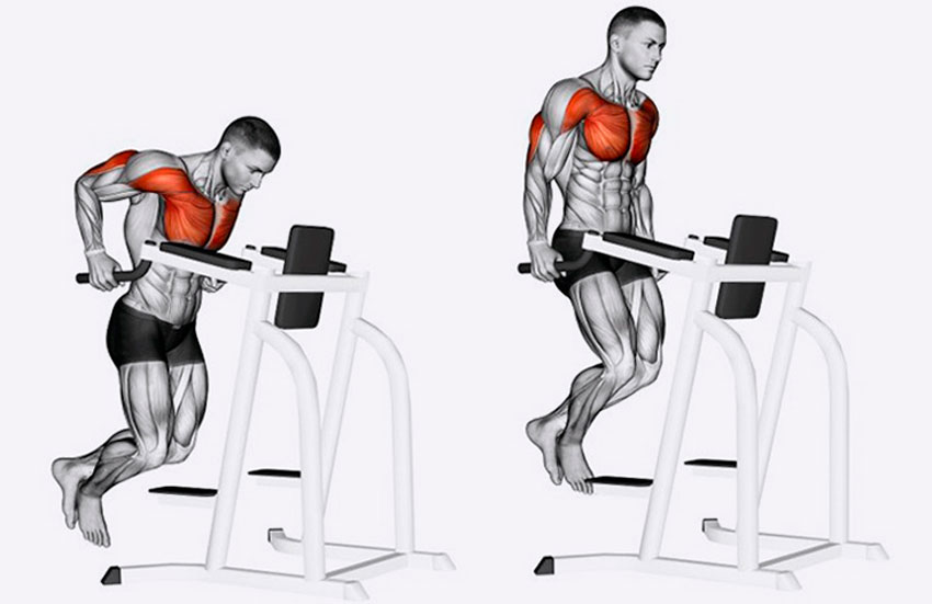Чтобы основная нагрузка приходилась на нижнюю часть груди, корпус нужно отклонить назад и сделать широкий хват (для этого использовать брусья с возможностью регулирования рукояток).