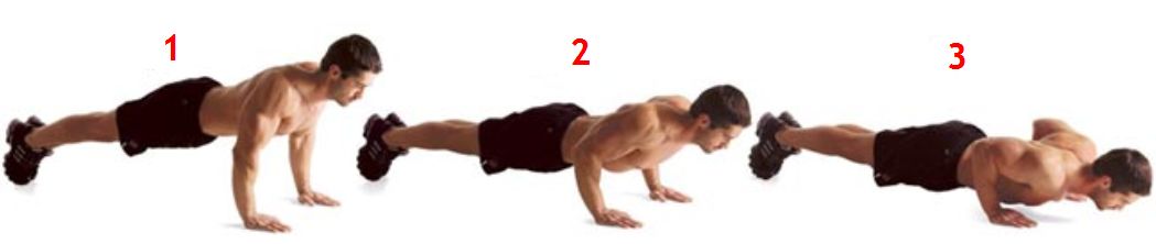 Это упражнение средней сложности. В дальнейшем его усложняют расположением ног на небольшом возвышении, а также рук, что позволяет ниже опускать корпус. При отжимании широким хватом действует закономерность: в зависимости от того, какие мышцы вы хотите заставить работать, чем ниже опускания, тем сильнее растягиваются мышечные ткани. Подставками могут послужить гири, диски и другие крепко стоящие предметы.