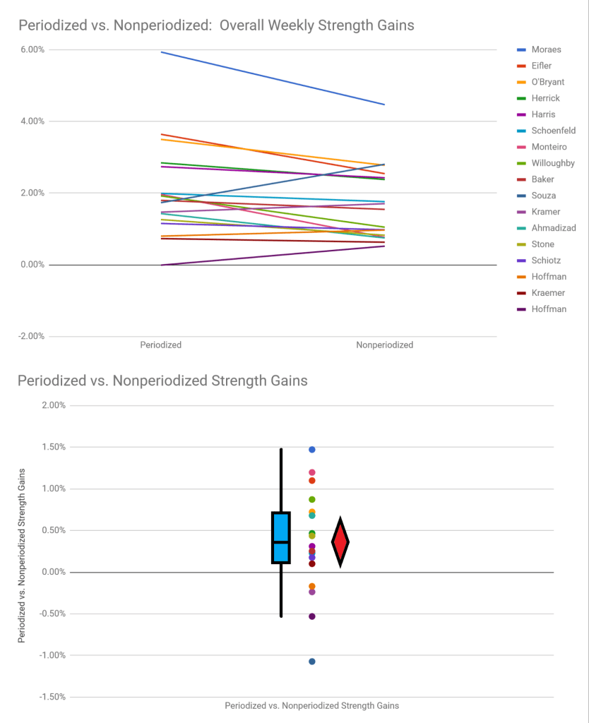 На нижнем графике блочная диаграмма с разницей результатов каждого исследования (положительное значение – лучше результаты от программы с периодизацией, отрицательное – без периодизации).