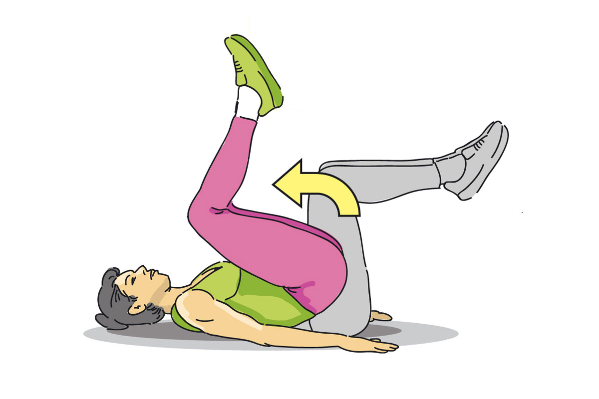 Исходное положение — лежа на спине, согнутые в коленях ноги подняты вверх. Пресс вытянут в линию, ягодицы слегка оторваны от пола. За счет силы поперечной мышцы живота медленно подтяните колени к груди, после чего вернитесь в исходное положение, не ослабляя контроля за мускулатурой. 3-4 подхода по 12-15 повторений.