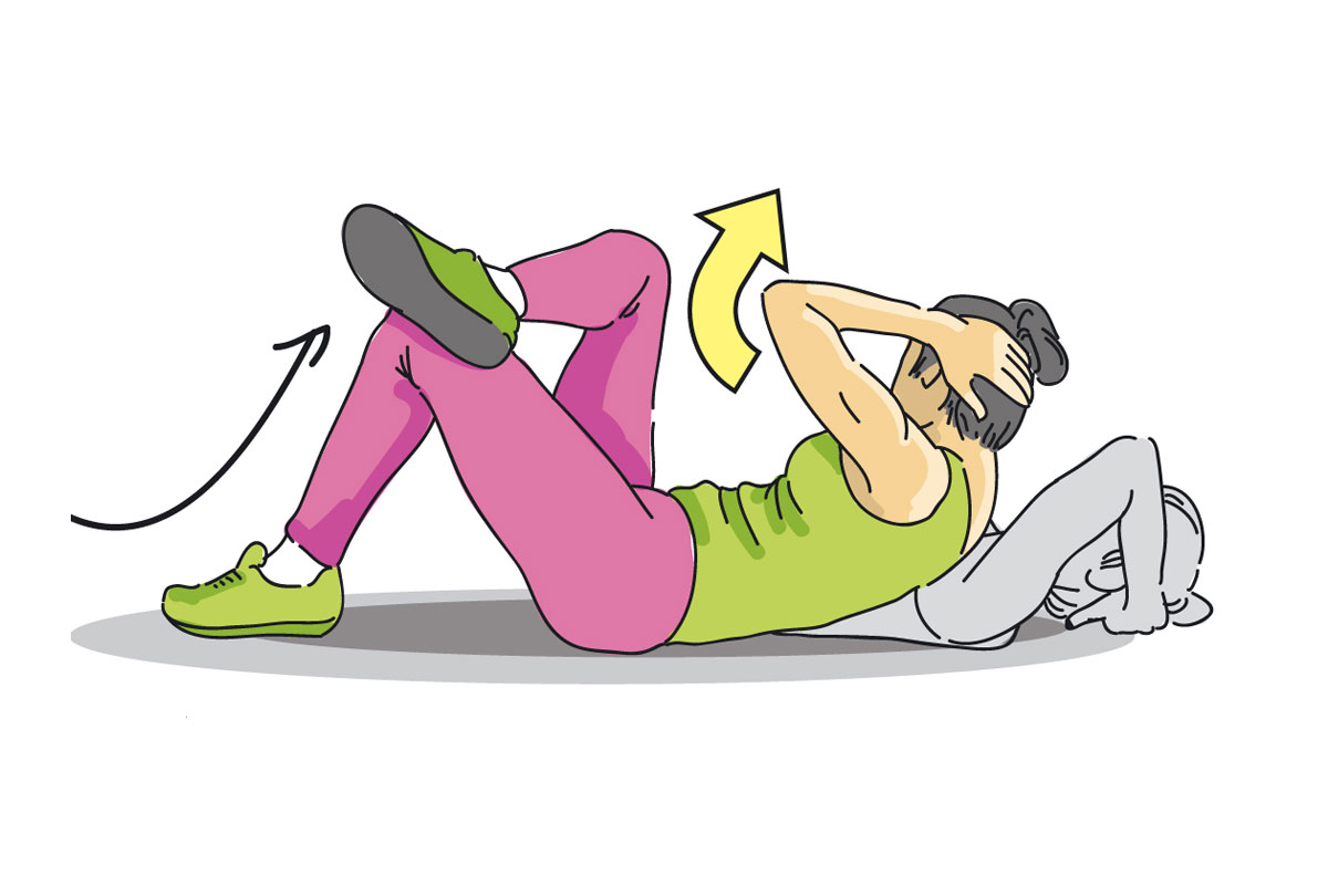 Исходное положение — лежа на спине, одна согнутая в колене нога на полу, другая заложена вверх. Руки за головой — однако без чрезмерного давления. На выдохе медленно тянитесь локтем к противоположному колену, сокращая пресс. Выполните 2-3 подхода по 12-15 повторений на каждую сторону.