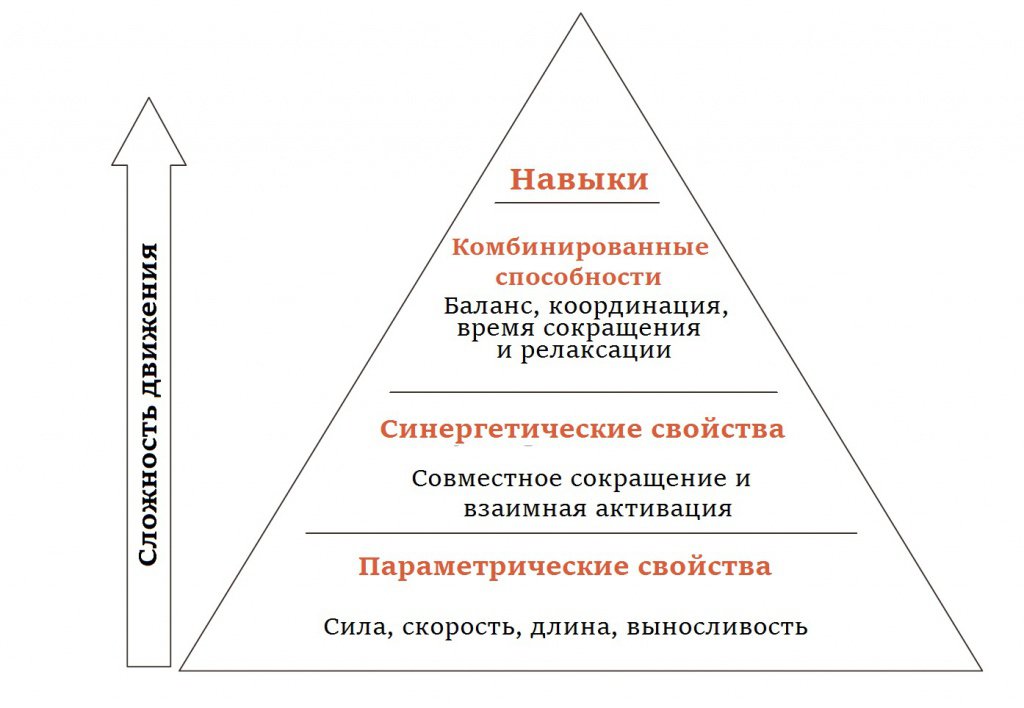 Рисунок 1. Контроль движения учитывает многие взаимосвязанные факторы: силу, скорость, выносливость, координацию работы мышц, баланс между двигательной активностью и расслаблением. Изменяя один компонент движения, мы изменяем и все.