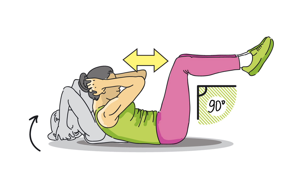 Исходное положение — аналогично предыдущему упражнению. Заложите руки на голову. Медленно приподнимите верх корпуса, направляя локти к коленям — максимально сокращая пресс при скручивании. Следите за тем, чтобы руки не давили на голову. Выполните 3-4 подхода по 12-15 повторений.