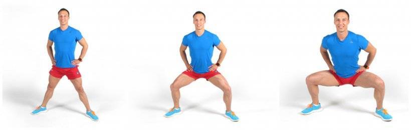 Для позиции сумо нужно широко расставить ноги, развернув при этом носки наружу. Отвести бедра назад и присесть до образования прямого угла в коленях, после чего как можно сильнее напрячь ягодичные мышцы и вернуться в положение стоя.