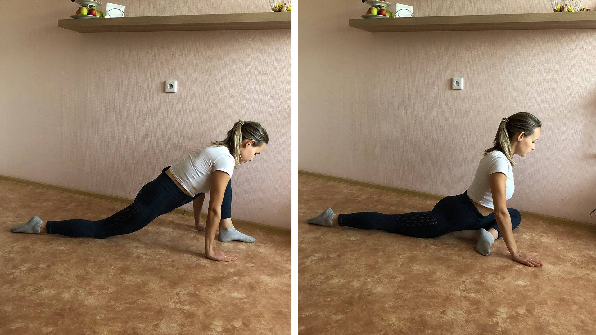Опустите колено задней ноги на пол, руки стоят по обе стороны от передней ногой. Задержитесь в этом положении, стараясь таз опускать максимально вниз. Можете выполнить несколько пульсирующих движений вверх-вниз, но затем задержитесь в статическом положении.