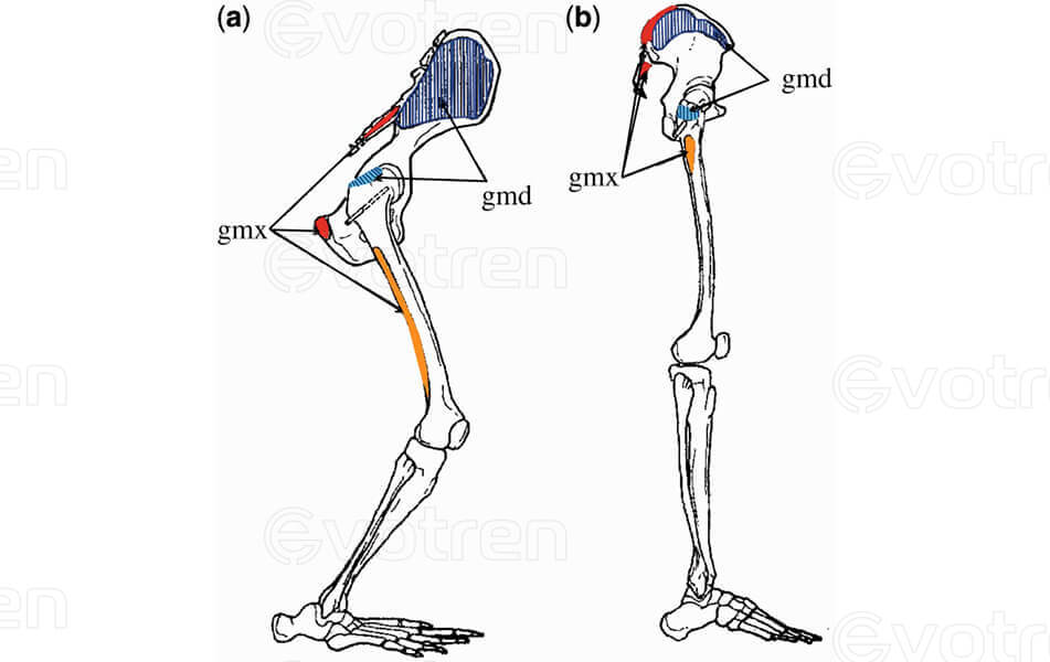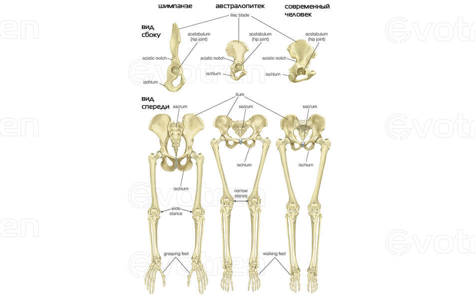 - Сравнение таза и нижних конечностей у шимпанзе, австралопитека и современного человека (см. изображение)