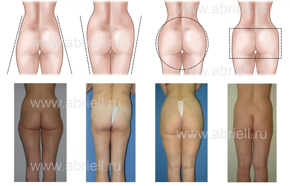 Строение ягодиц обуславливают такие параметры, как анатомия тазовых костей и особенности распределения жировых отложений. Принято различать 4 вида ягодиц: А-образная, V-образная, прямоугольная, круглая.