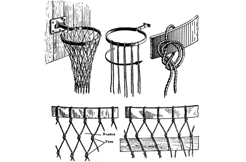 Сплести сетку можно из 24 отрезков веревки. Длину их выбирают в 2-2,5 раза длиннее диаметра кольца. Края вяжут к обручу через равные отрезки. Затем попарно связывают веревки посередине. На следующем этапе процесс повторяют со свободными краями. И так еще раз. В результате получится сужающаяся сетка. Инвентарь, конечно, будет далек от стандартов и совершенства, однако для тренировок дома с мячом его вполне должно хватить.