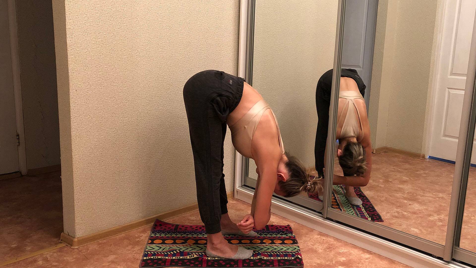 Из положения стоя, выполните наклон корпуса к бедрам, касаясь по возможности руками пола. Не нужно делать резкие и пружинящие движения. Задержитесь в одной точке при максимальном вытяжении мышц на 10-15 секунд.
